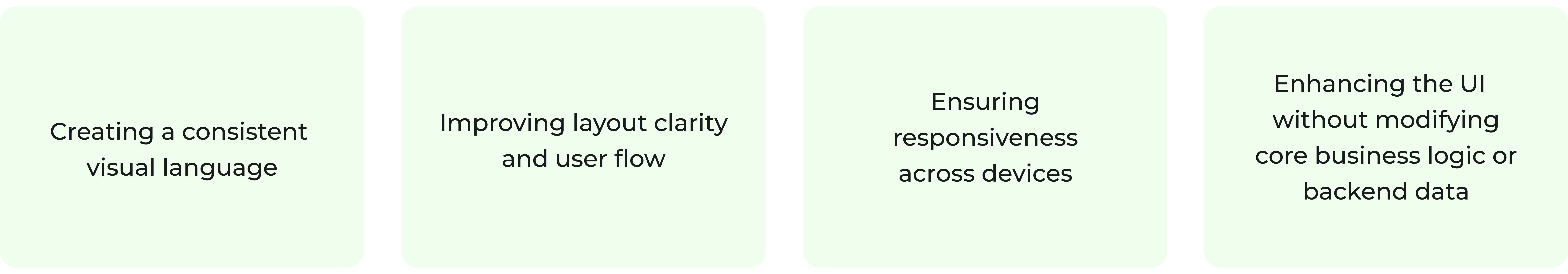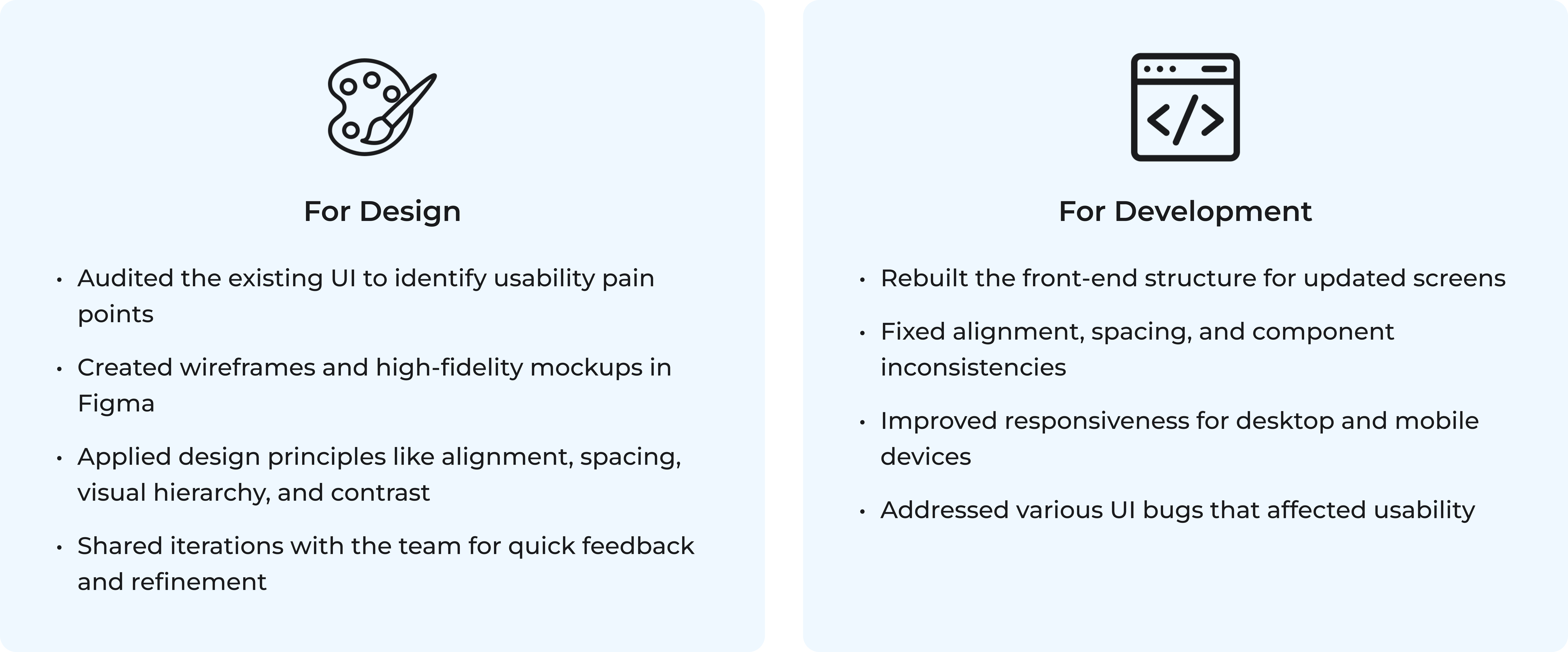 This project taught me how to balance visual design improvements with front-end development constraints. Working on both design and implementation allowed me to better understand how small UI tweaks can create a big impact in usability.